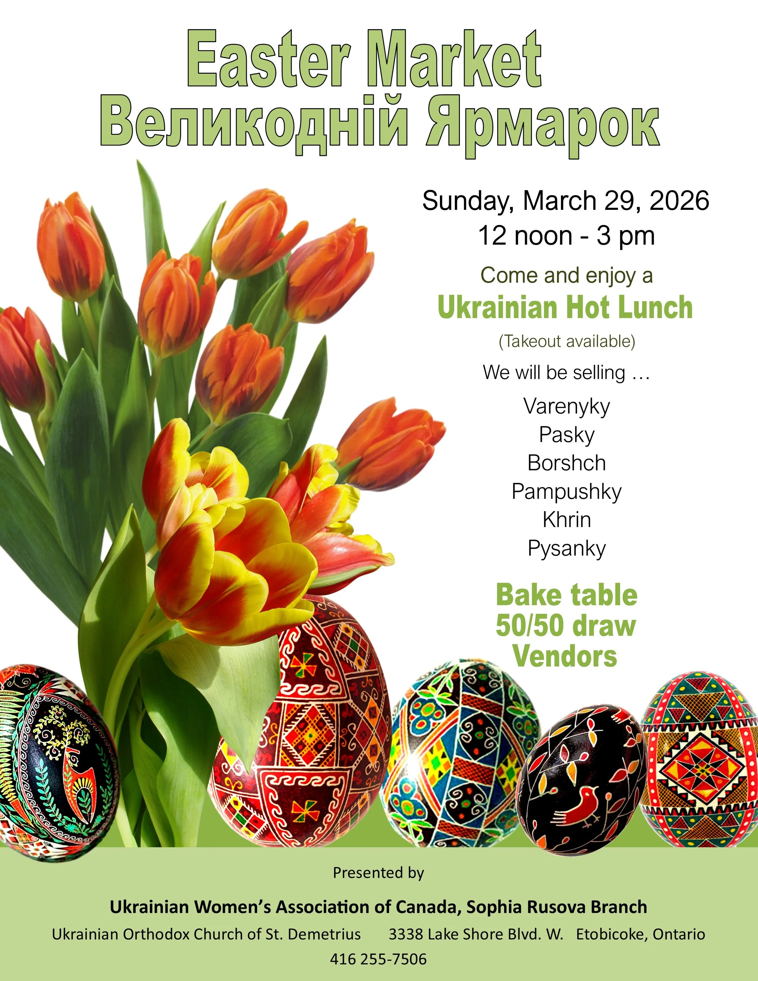 EVENT: Easter Market Community NewsCommunity Event Mar 12 Written By Kira Kralytsia Mar. 29 / 2026 - 12-3pm | 3338 Lake Shore Blvd. W., Etobicoce View fullsize Kira Kralytsia
