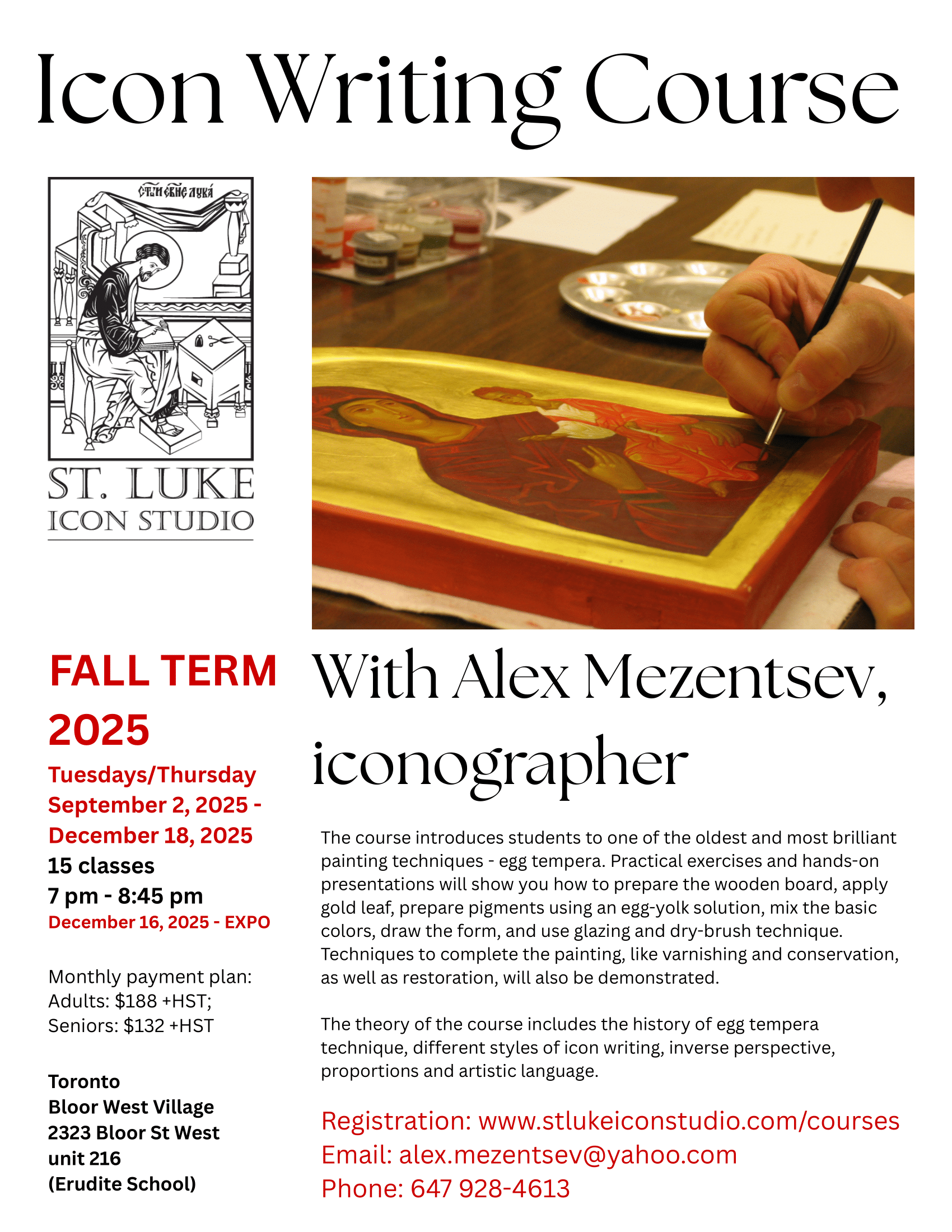 COURSE: Icon Writing Community NewsCommunity Event Aug 27 Written By Kira Kralytsia Sep. 2 - Dec. 18/2025 - 7 pm - 8:45 pm | 2323 Bloor St West, Toronto View fullsize Kira Kralytsia