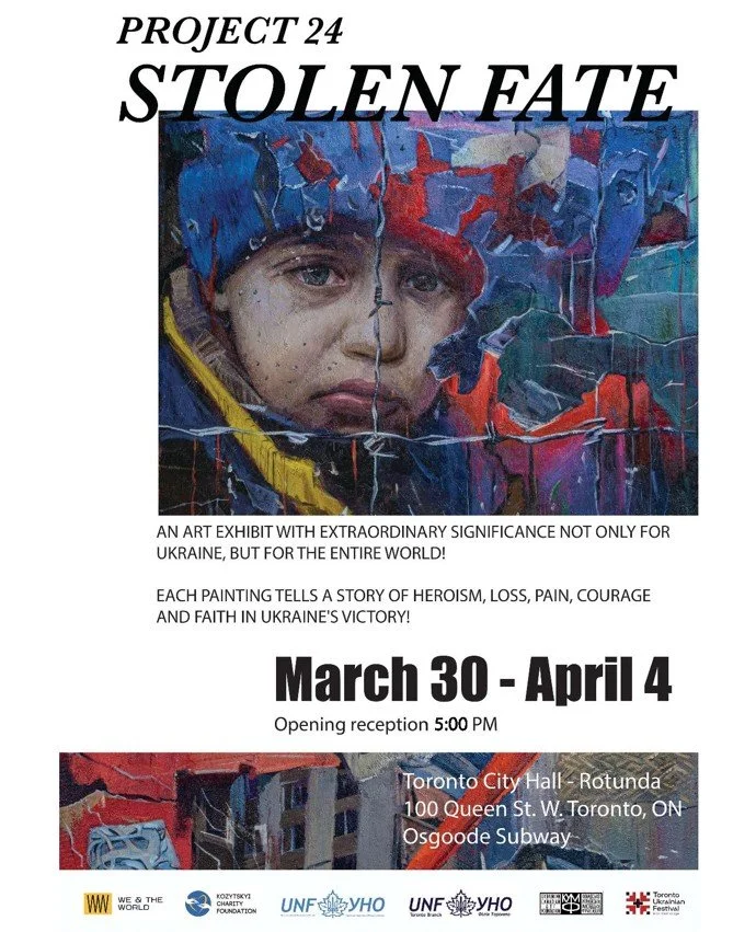 The Toronto Ukrainian Festival, the Ukrainian National Federation Toronto Branch, the Ukrainian National Federation of Canada and the Canadian Ukrainian Art Foundation invite you to the Opening Reception of the "Project 24"- Stolen Fate Art Exhibit at Toronto City Hall, featuring artwork by Ukrainian Artists in Ukraine, depicting the horrors perpetrated by Russia since its invasion of Ukraine and the resilience of Ukraine and it's people.