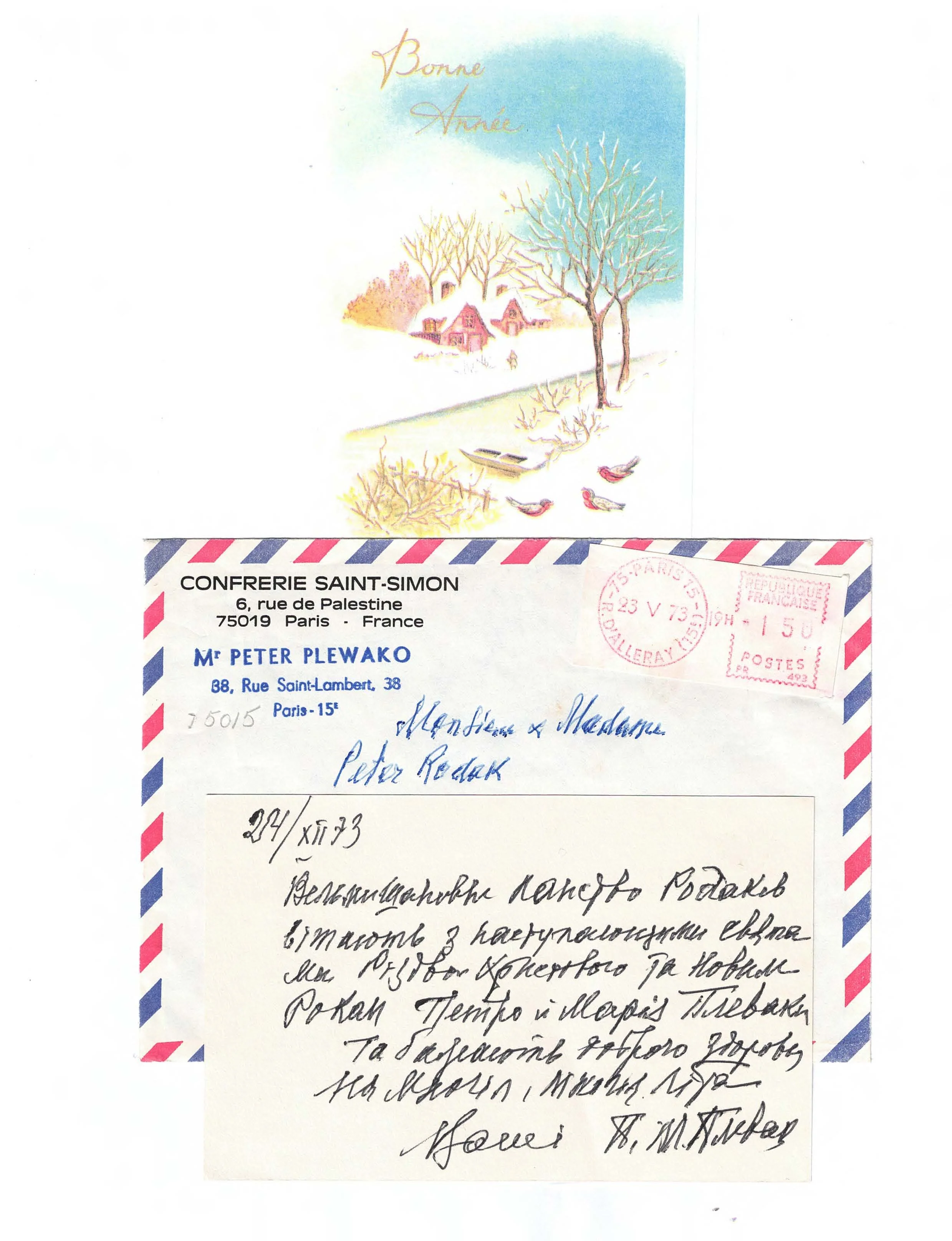 Різдвяна листівка з 24 грудня 1973 року від подружжя Петра і Марії Плевако з Франції.