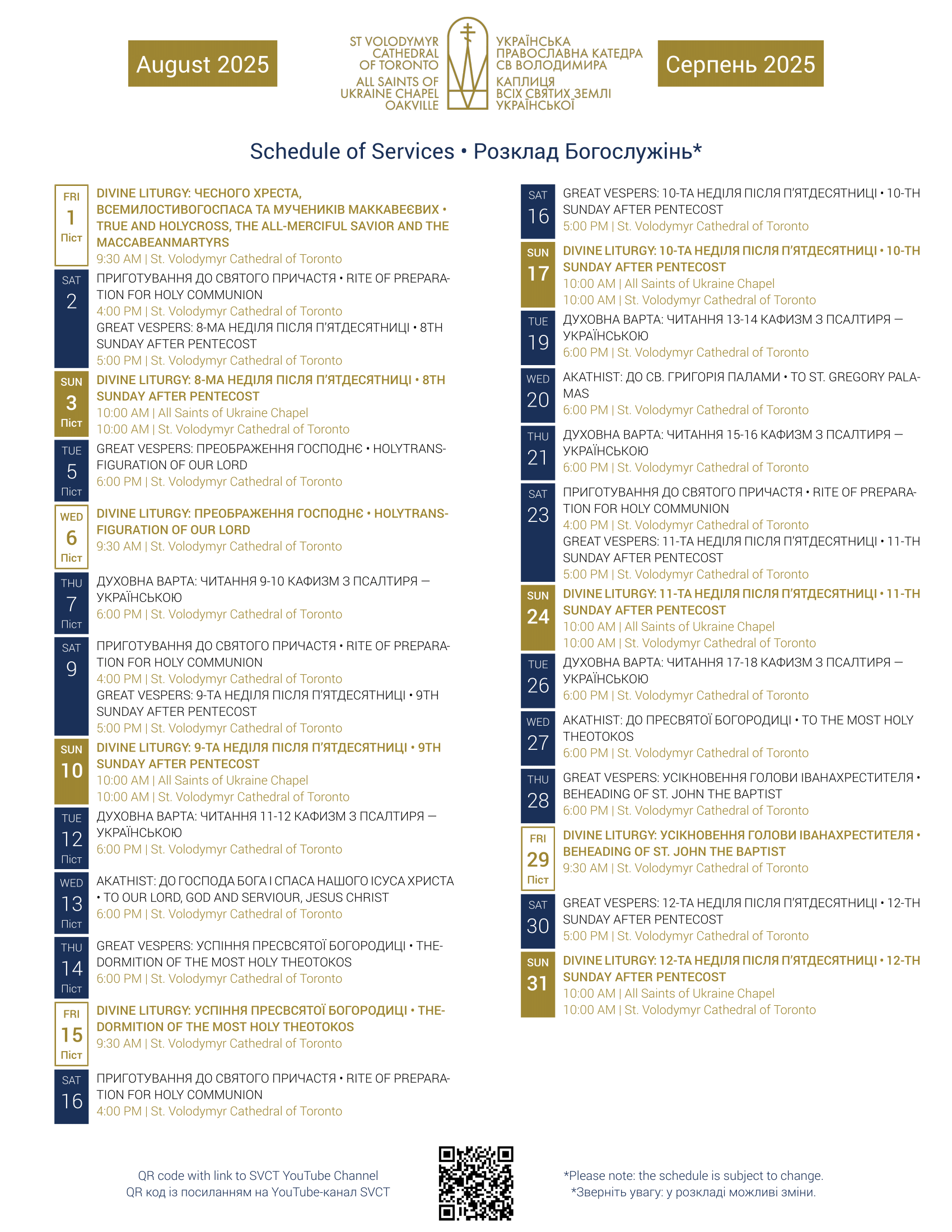 August 2025 Schedule • Розклад богослужінь на серпень 2025 Monthly Schedule Jul 25 Written By Kira Kralytsia Click on the image for the PDF. Натисніть на фотографію для PDF. Kira Kralytsia