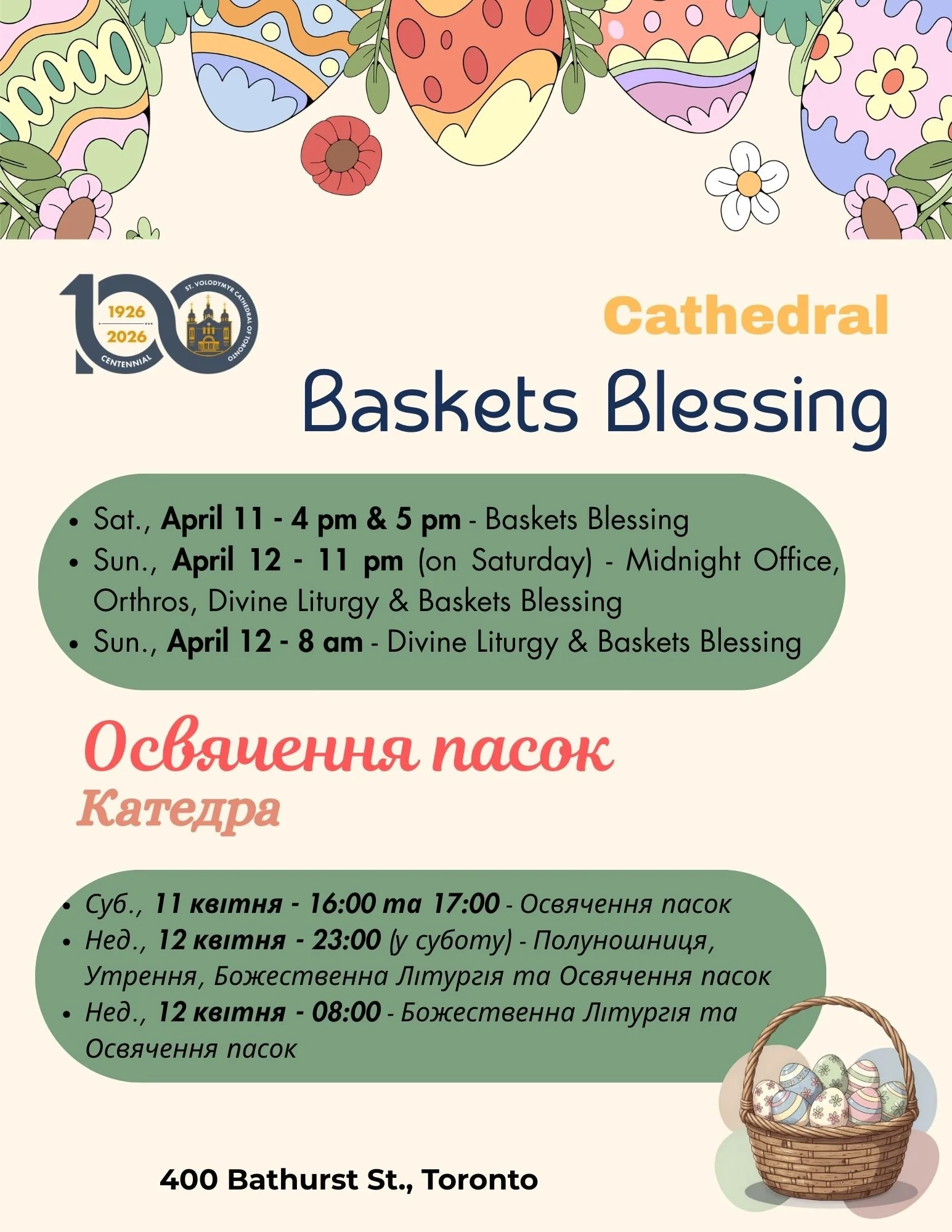 Освячення кошиків відбудеться після Пасхальної Літургії на паркувальній площадці біля катедри. По прибутті до катедри, будь ласка, залиште ваш кошик у церковному залі, який розташований на нижньому поверсі катедри, і приєднайтеся до Пасхальної Літургії.