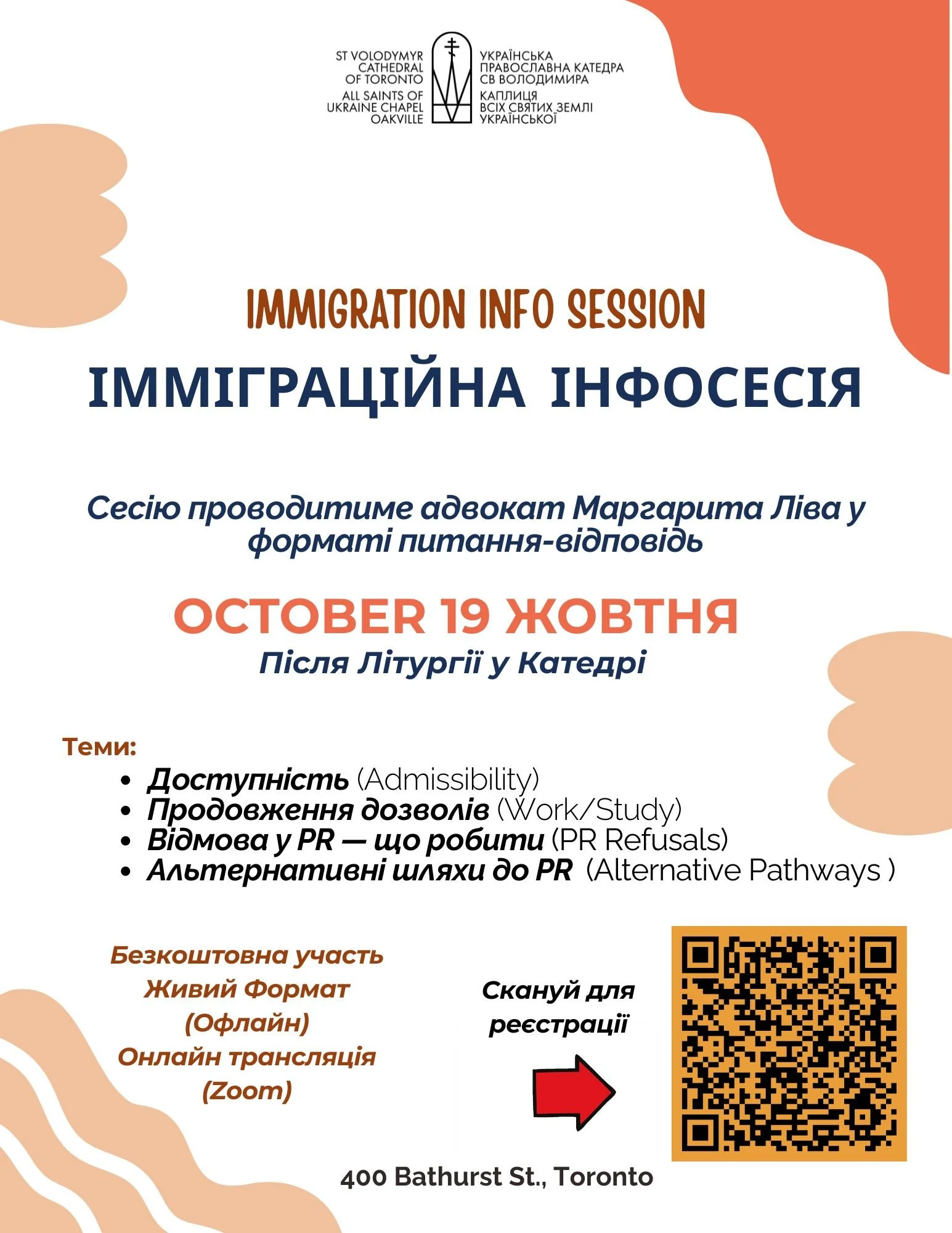 У неділю, 19 жовтня 2025, одразу після недільної літургії, у катедрі відбудеться спеціальна зустріч, яку проводитиме запрошена спікерка, адвокат Маргарита Ліва. Вона розповість про доступність до імміграції, дозволи на роботу/навчання, варіанти для тих, хто отримав відмову, та альтернативні шляхи до PR.