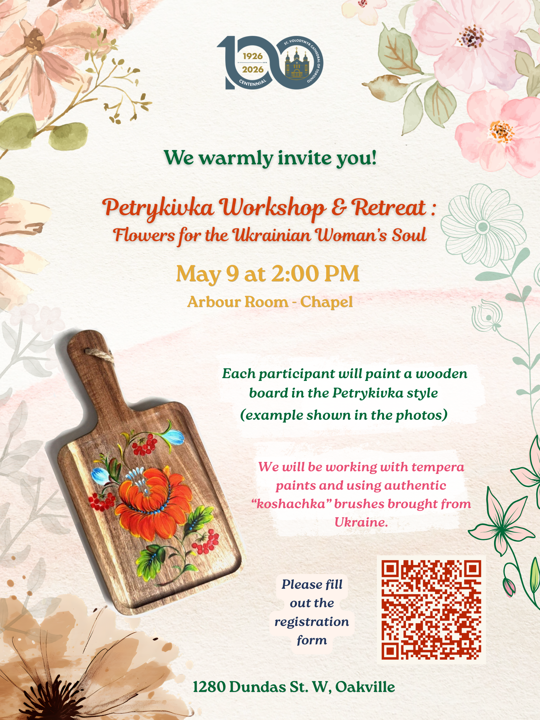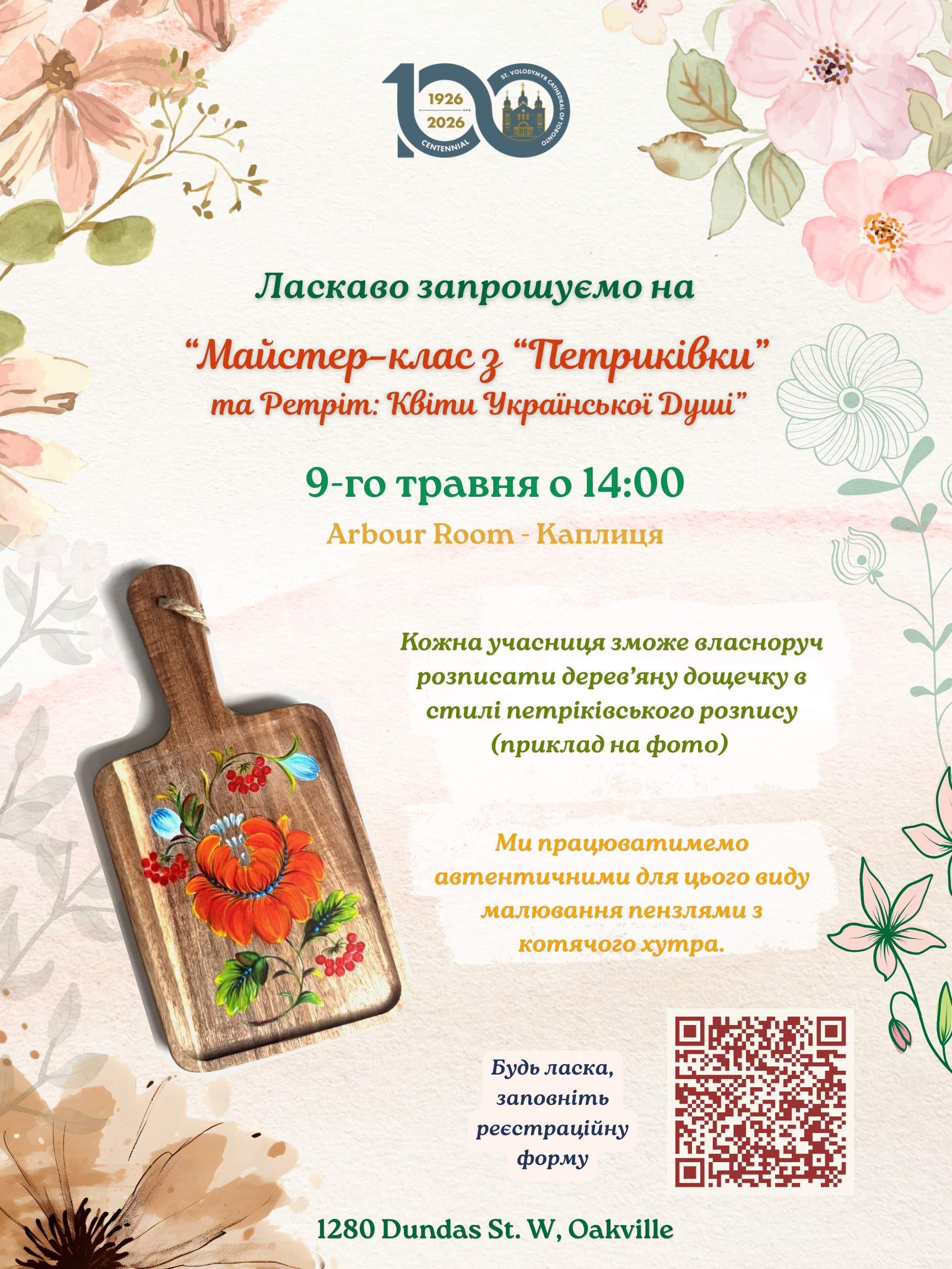 You are cordially invited to attend our first Petrykivka Workshop and Women’s Retreat, which will take place on May 9 at 2:00 PM in the Arbour Room at St Volodymyr Cultural Centre in Oakville. The event will last approximately three hours, and a delightful reception at the end will surely add a sweet touch to the celebration.