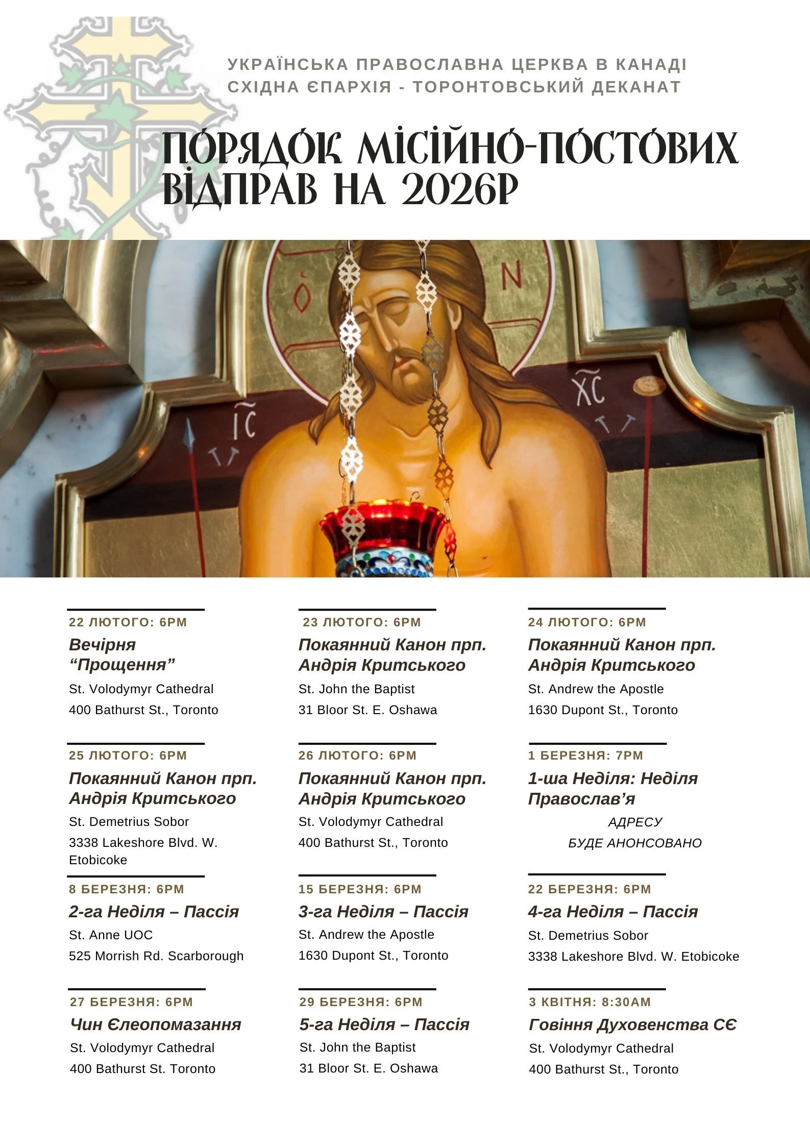 Schedule of Lenten Services Toronto Deanery 2026 Great LentEastern Eparchy News Feb 18 Written By Kira Kralytsia Порядок Місійно-Постових Відправ 2026 View fullsize View fullsize Kira Kralytsia