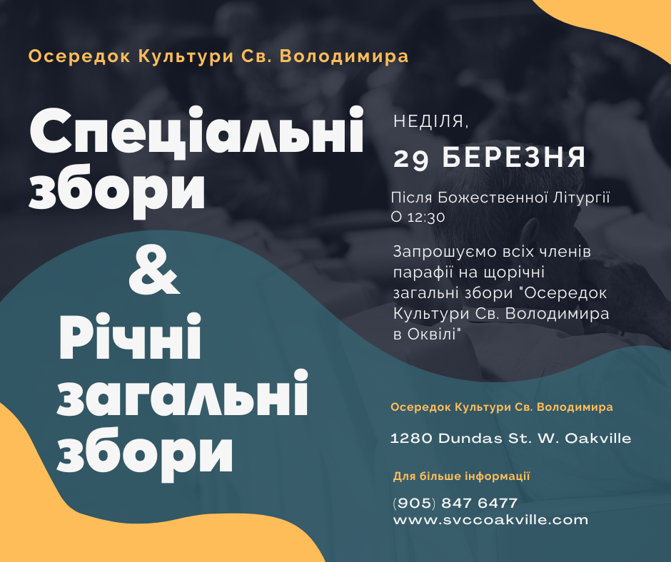 On Sunday, St. Volodymyr Cultural Centre March 29, 2026, the St. Volodymyr Cultural Centre (as incorporated by St. Volodymyr Cathedral of Toronto) in Oakville, will host its Special Meeting and 2025 Annual General Meeting. The SVCC board of directors will present the financials and reports as related to the 2025 Corporation activities.