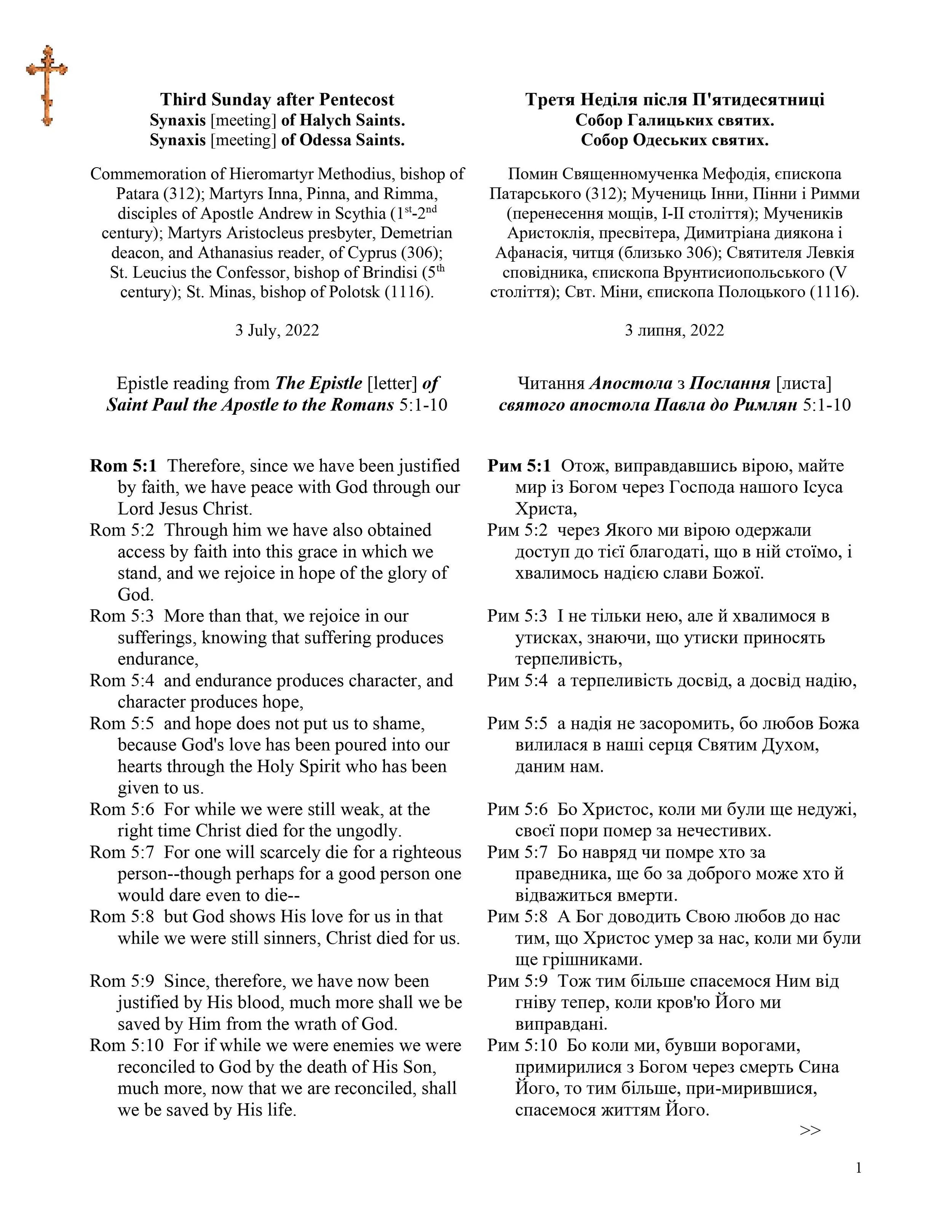 Читання Апостола з Послання [листа] святого апостола Павла до Римлян 5:1-10