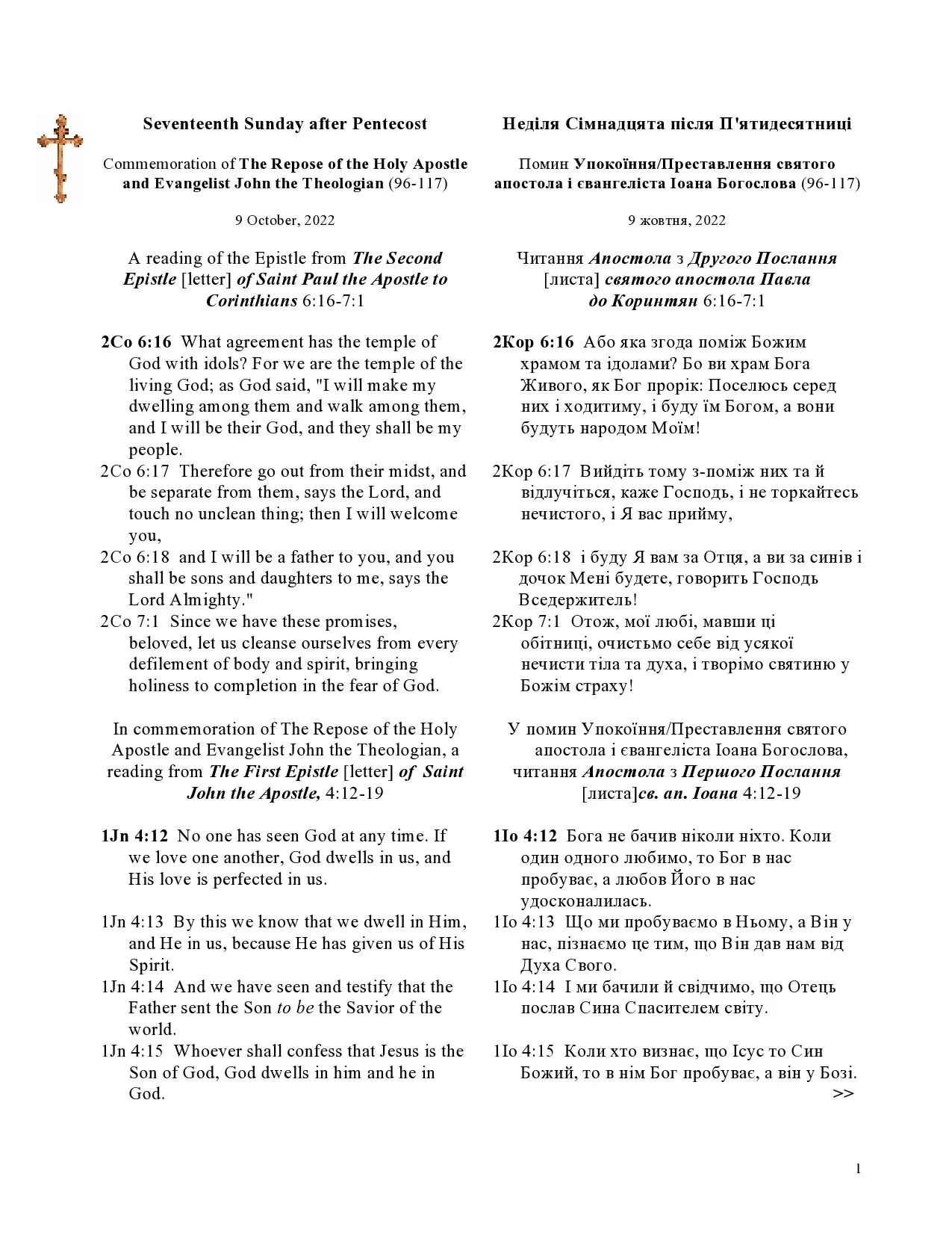 У помин Упокоїння/Преставлення святого апостола і євангеліста Іоана Богослова, читання Апостола з Першого Послання [листа]