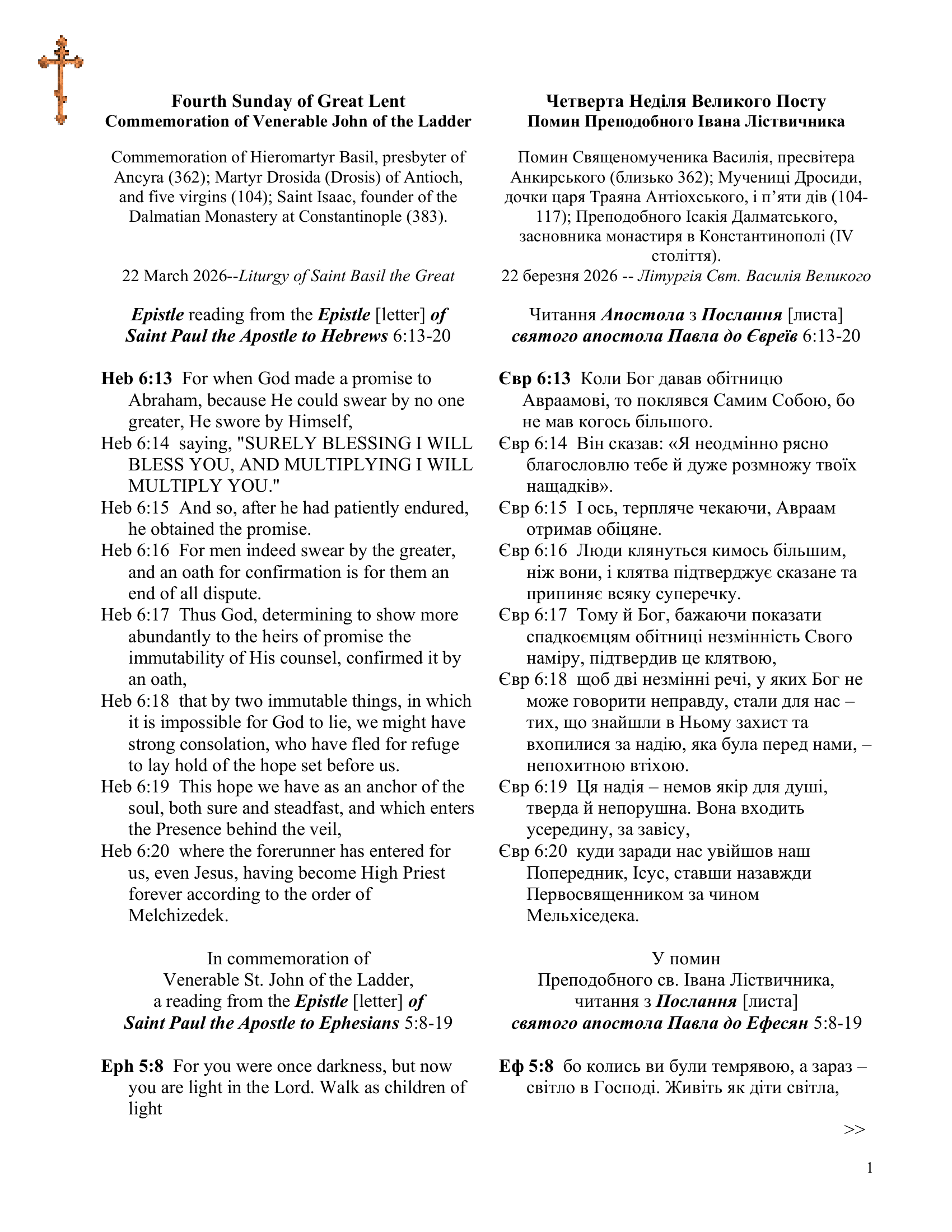 Sun. March 22, 2026 • Нед. 22 березня 2026 р. Weekly Readings Mar 18 Written By Kira Kralytsia weekly readings Kira Kralytsia