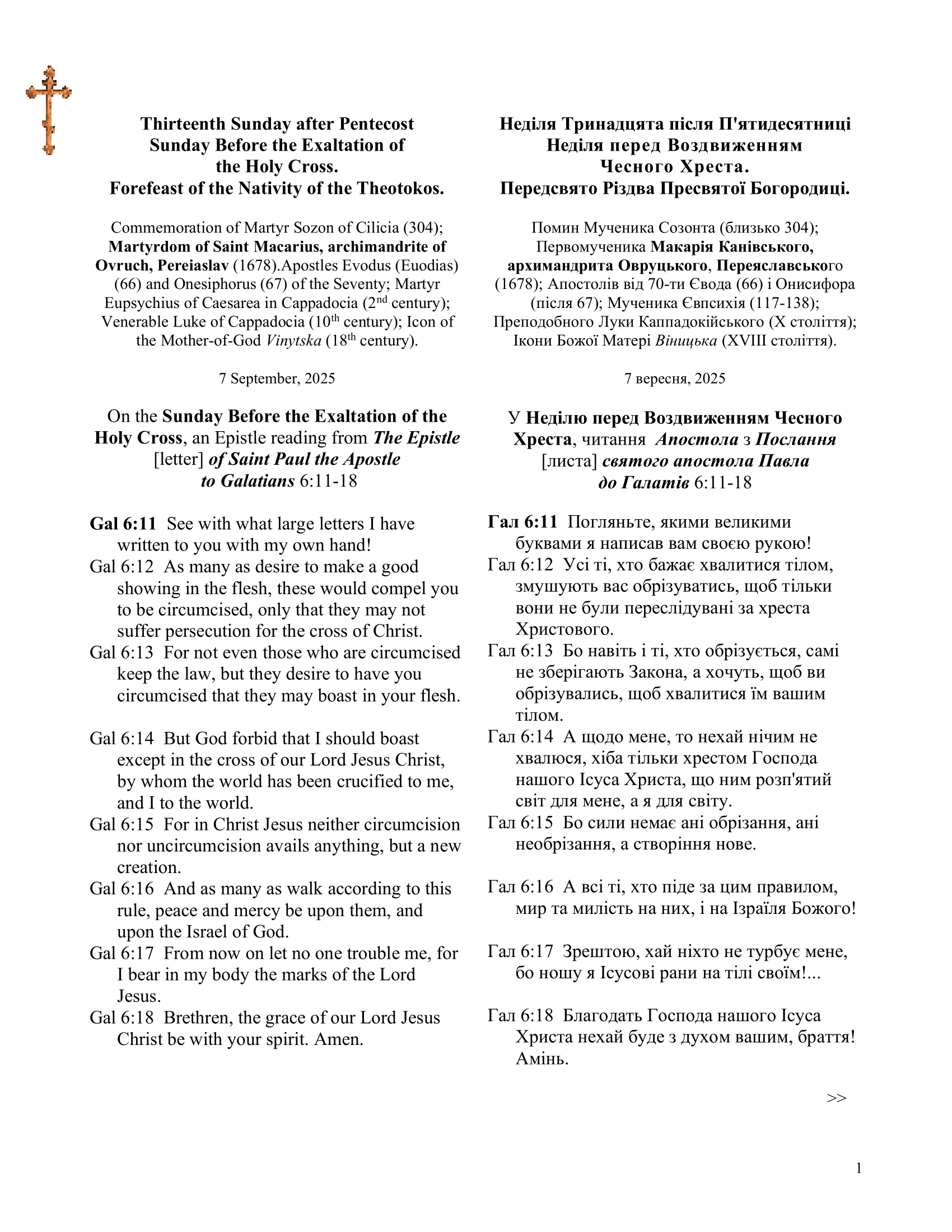 Sun. September 7, 2025 • Нед. 7-ме вересня 2025 р. Weekly Readings Sep 3 Written By Kira Kralytsia weekly readings Kira Kralytsia